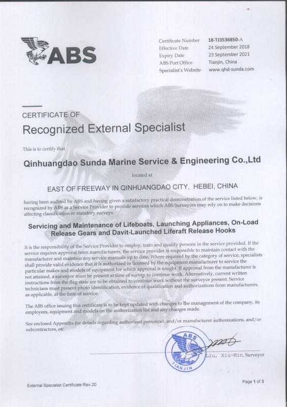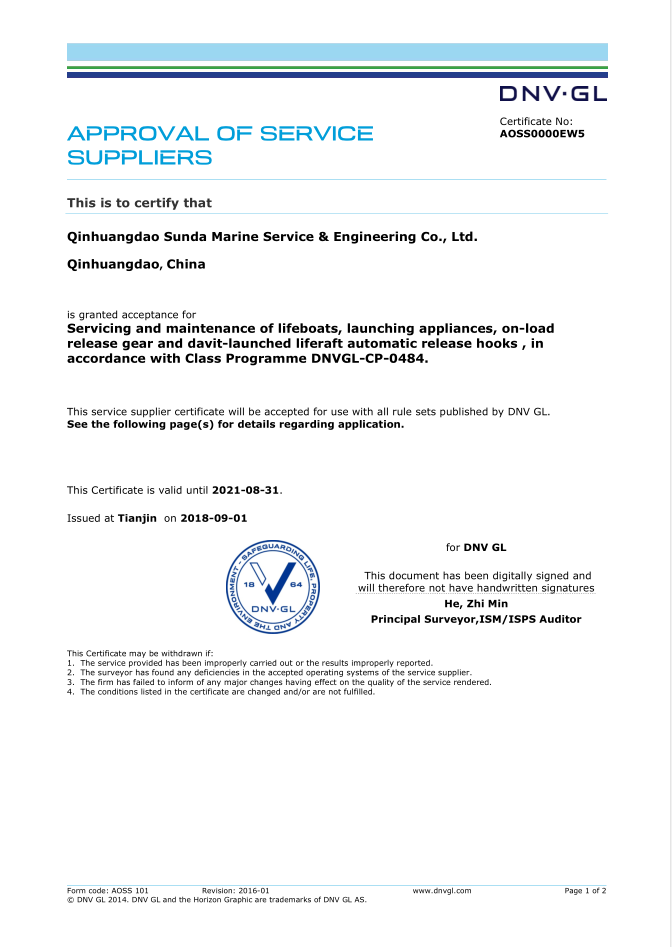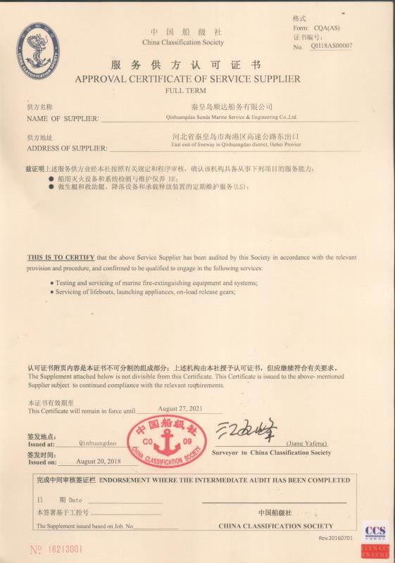 秦皇島順達(dá)船務(wù)有限公司位于美麗的海濱城市、中國(guó)北方著名的能源輸出大港--秦皇島。公司從事于船舶修理、物料供應(yīng)、水下檢測(cè)、船體測(cè)厚、消防救生設(shè)備及救生艇檢驗(yàn)、電氣自動(dòng)化修理等服務(wù)。 公司自1997年成立至今,先后為國(guó)內(nèi)外船東修理、檢驗(yàn)各類船舶萬(wàn)余艘,積累了豐富的施工經(jīng)驗(yàn)。公司現(xiàn)有場(chǎng)地100余畝,員工30余人,以及工程用車若干臺(tái)。我們公司一直本著嚴(yán)以律己、真誠(chéng)待人、精益求精、信譽(yù)至上的經(jīng)營(yíng)理念,以優(yōu)質(zhì)的服務(wù)、專業(yè)的施工、合理的收費(fèi),得到了國(guó)內(nèi)外船東的廣泛認(rèn)可,贏得了良好的口碑和信譽(yù)。 公司已取得了中國(guó)船級(jí)社(CCS)、美國(guó)船級(jí)社(ABS)、日本船級(jí)社(NK)、德國(guó)船級(jí)社(DNV GL)等各個(gè)船級(jí)社的消防救生和救生艇檢驗(yàn)資質(zhì), ...